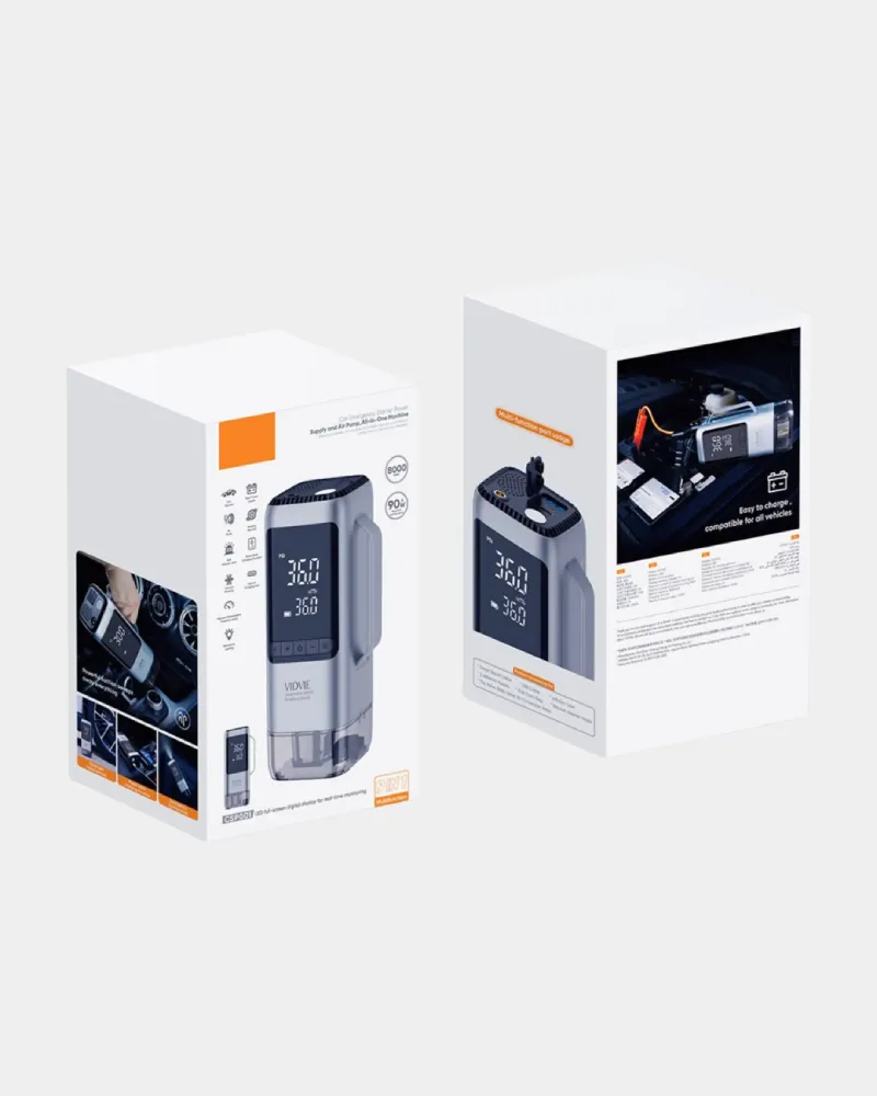Cargador de Emergencia para Auto 9 en 1 Vidvie CSP001, un dispositivo multifuncional ideal para llevar en el carro. Funciona como arrancador de batería, power bank y herramienta de emergencia, todo en un solo equipo compacto y seguro.